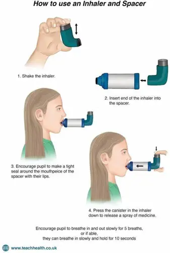 (An infographic demonstrating the correct technique for using a reliever inhaler with a spacer.)