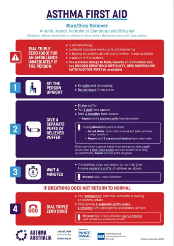 It’s vital to act fast. Delays can increase the risk of severe asthma or hospitalisation. Always follow the 4-step asthma first aid plan and call triple zero (000) if symptoms are severe.