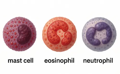 Figure 2. Mast cells and Eosinophils are seen in asthma driven mainly by Type 2 inflammation. Neutrophils are activated by non-type 2 inflammation. These cells cause changes in the lungs and airways resulting in asthma symptoms.